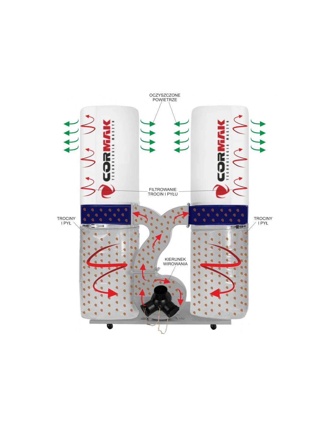 Podtlakový tah vzduchu dokonale odsává přebytečné piliny vznikající při mechanickém zpracování dřeva během provozu stroje. Pevná konstrukce odsávacího zařízení byla vylepšena přídavnými podpěrami v základně, které zaručují stabilní a bezvibrační provoz zařízení.