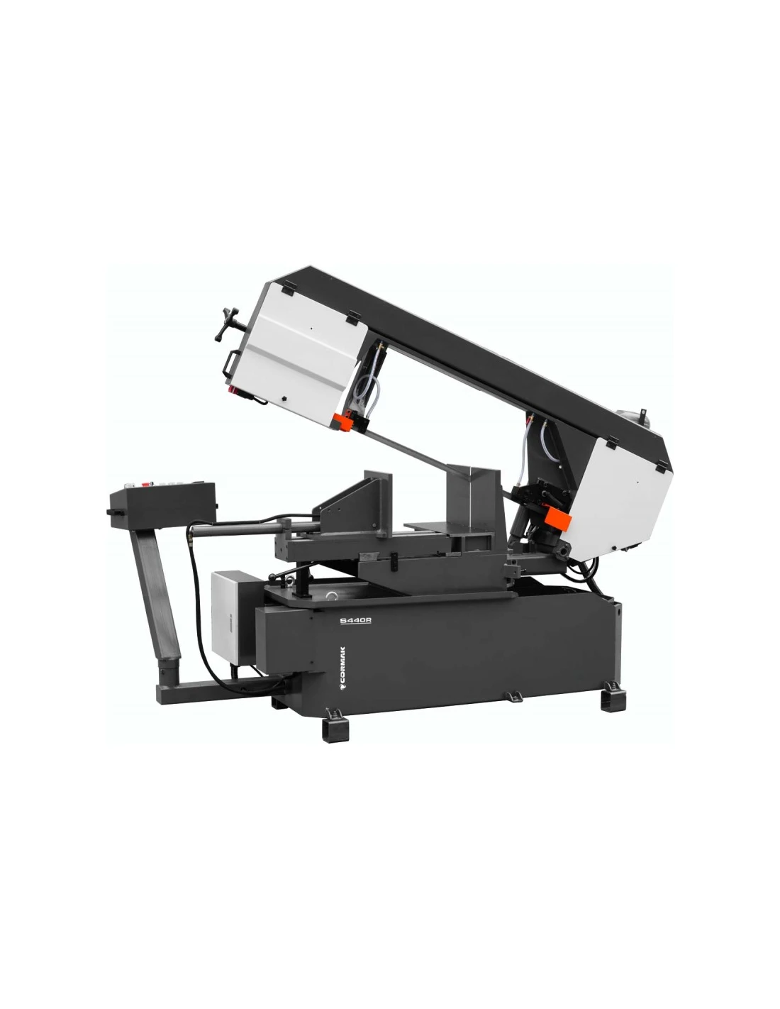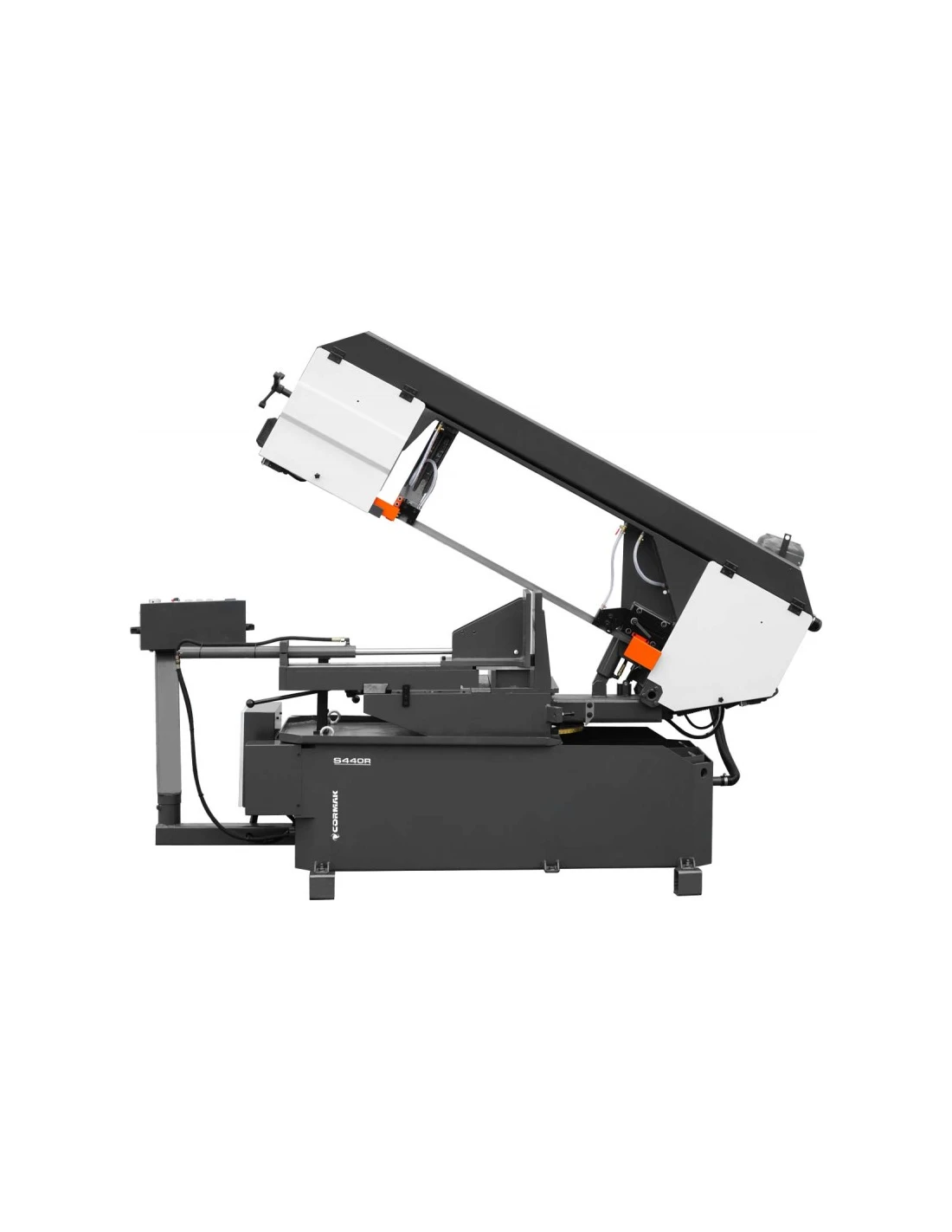 Poloautomatická pásová pila CORMAK S440R. Řezné rameno je vyrobeno z jednolitého litinového odlitku spolu s použitím 34mm řezného pásu, což umožňuje plnohodnotné řezání profilů i plných materiálů. Součástí pásové pily je svěrák a hydraulické spouštění a zvedání ramene.