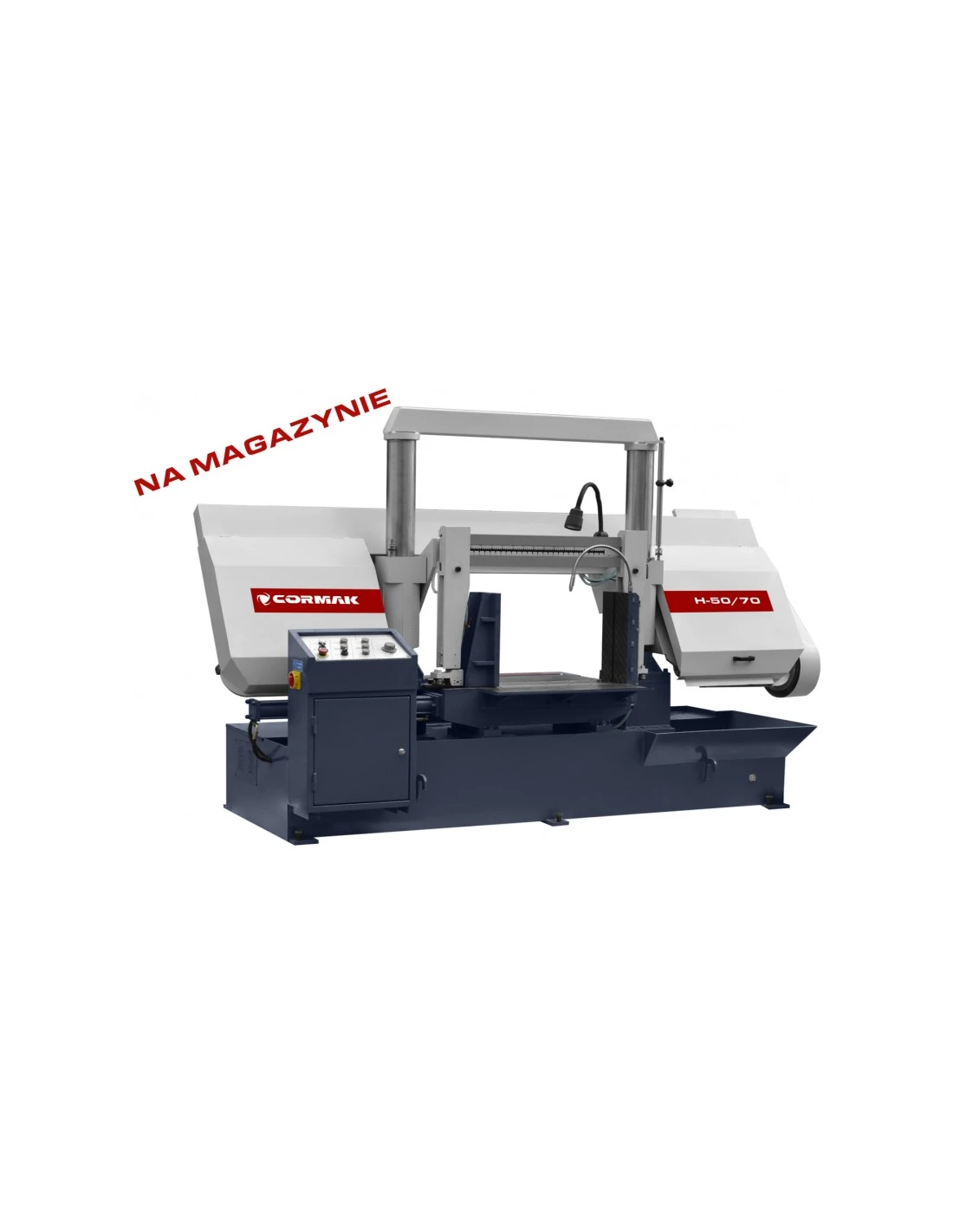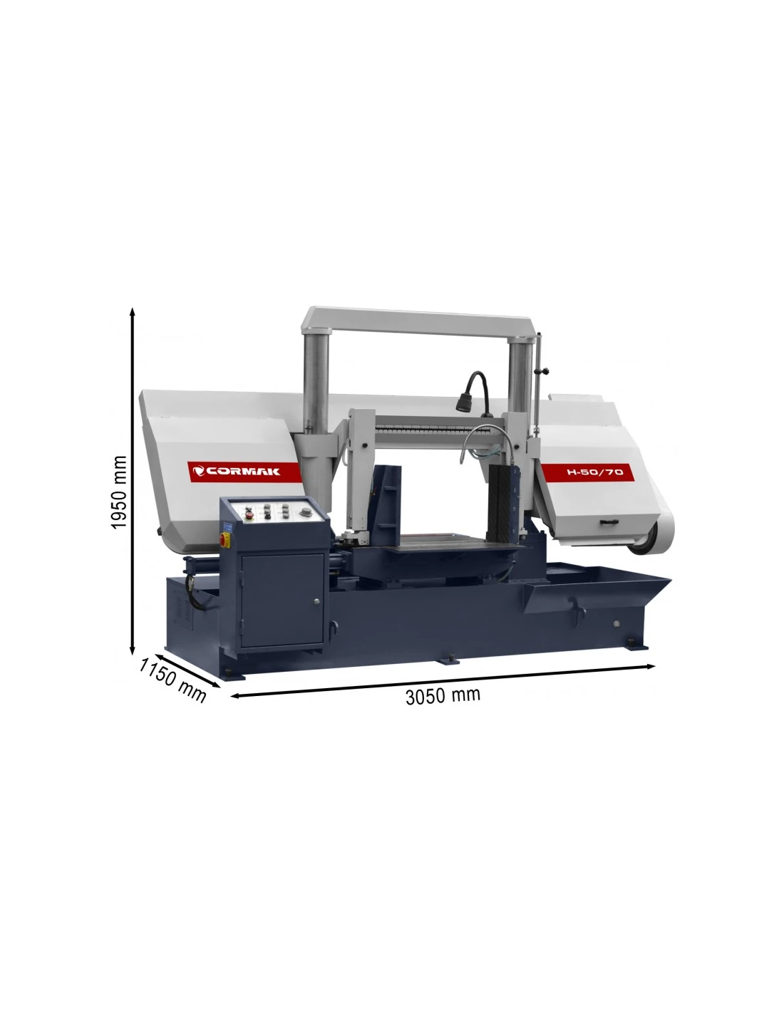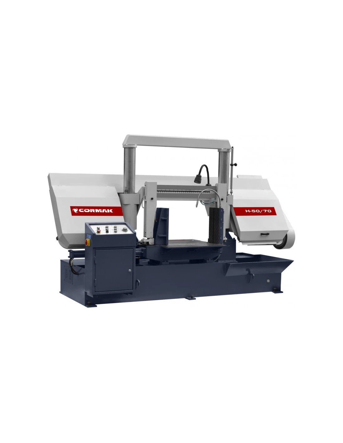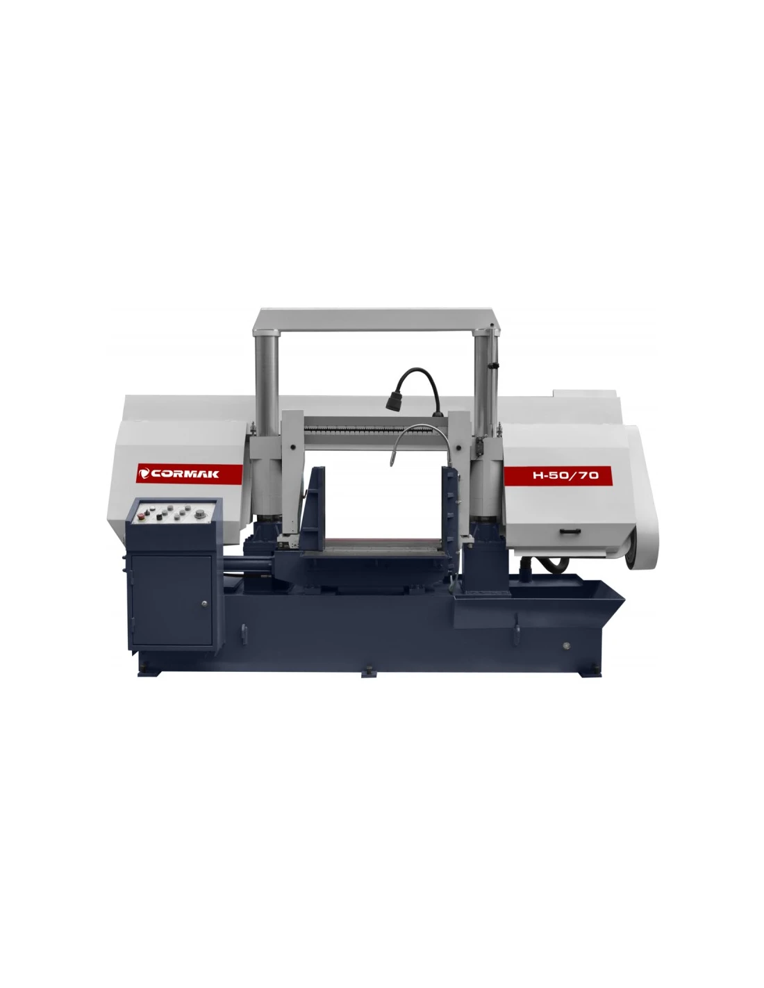 Dvousloupová pásová pila CORMAK H-50/70 je vysoce výkonný stroj pro poloautomatické řezání plných materiálů a profilů z oceli, litiny a neželezných kovů. dvousloupová konstrukce zajišťuje větší tuhost při řezání a použití zcela odlišné technologie vedení ramene a pásu ve srovnání s nůžkovými stroji výrazně zkracuje čas a zvyšuje přesnost řezání.