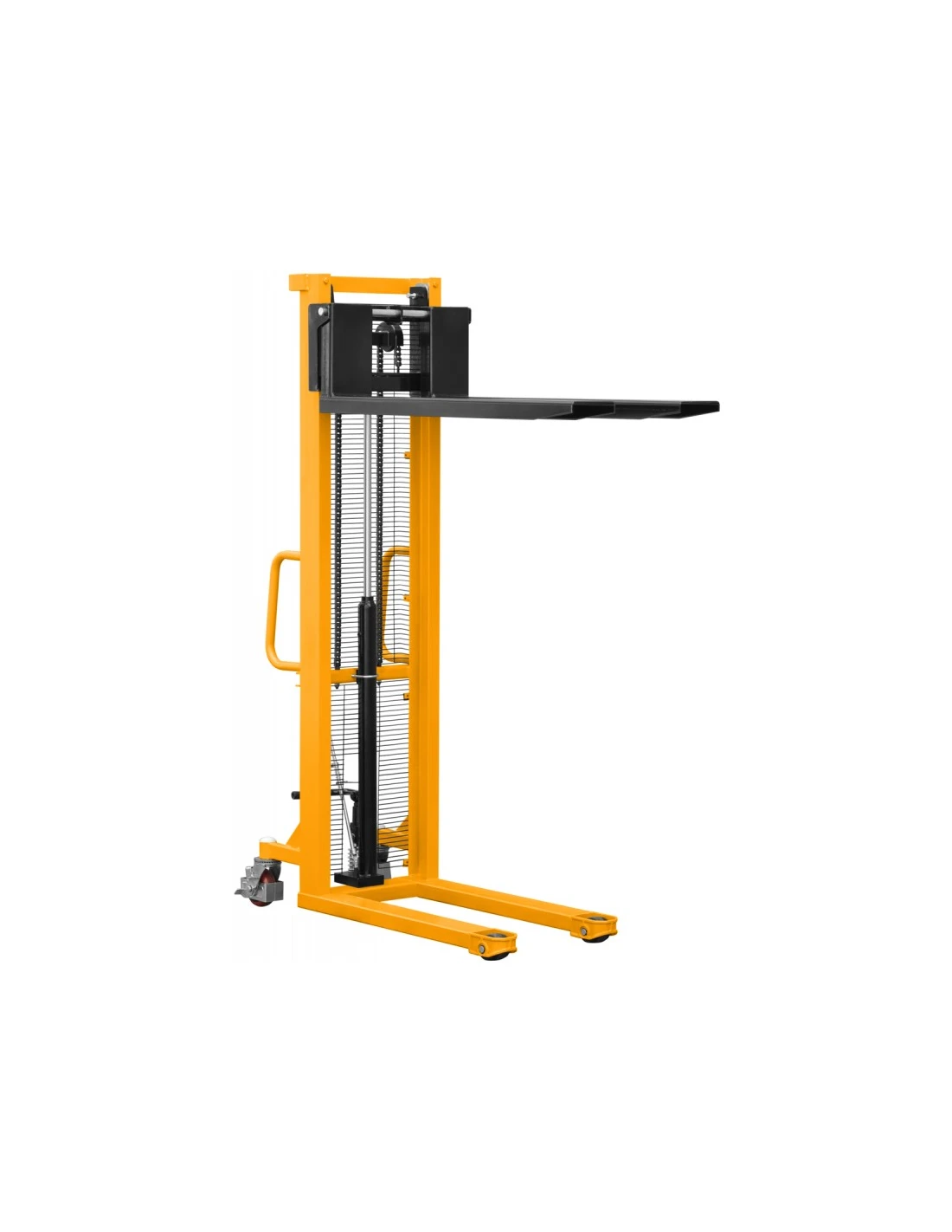 Ruční stožárový vysokozdvižný vozík P716 s nosností 700 kg je robustní, jednoduché a spolehlivé zařízení. Hydraulické zvedání se provádí pomocí nožního pedálu, zatímco spouštění nákladu je plynulé pomocí otočení páky. Ocelová konstrukce přispívá ke stabilitě a bezpečnosti tohoto moderního vozíku.