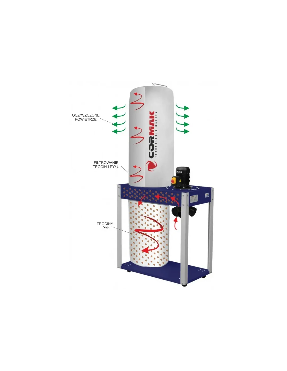 Odsávání CORMAK FM340 400V je založeno na ocelové konstrukci vybavené odolným ventilátorem na piliny s kovovým, vyváženým rotorem. Pouzdro a vzduchové kanály jsou plně utěsněny, což zabraňuje ztrátě sacího výkonu. Sací hlava otočná o 180° usnadňuje ergonomické rozložení odsávacích hadic. Velká kapacita vaků - až 190 litrů - umožňuje delší práci bez přerušení na vyprázdnění.