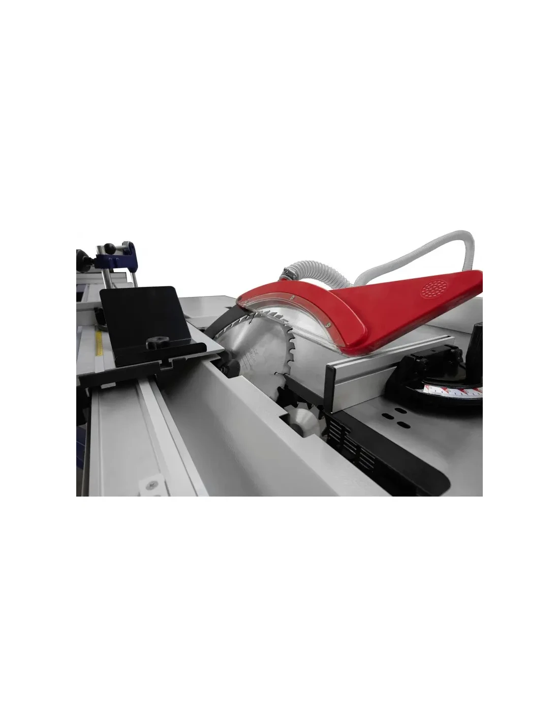 Pohyb materiálu podporuje posuvný vozík s ložiskovým vedením a čitelné stupnice délky a úhlu umožňují rychlé a přesné nastavení řezných parametrů.